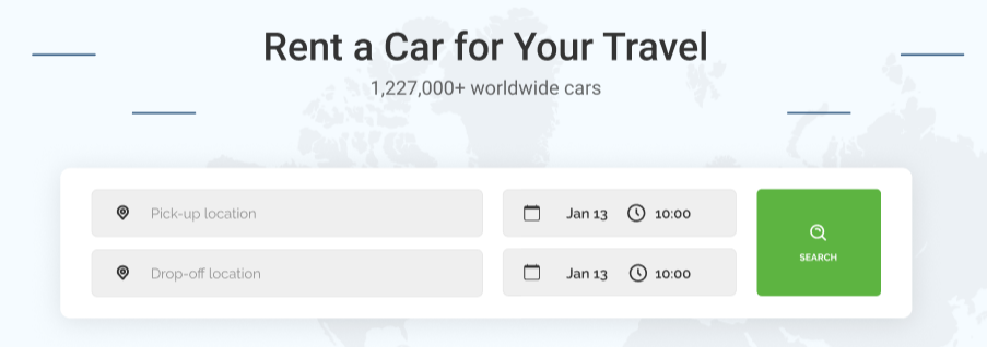 Click on “Cars” tab. Key in “Pick-up Location” and “Drop-off Location.” You will be supported by a drop-down list. Mouse over the list and select. Set the dates and time and then click on “Search Cars” tab.