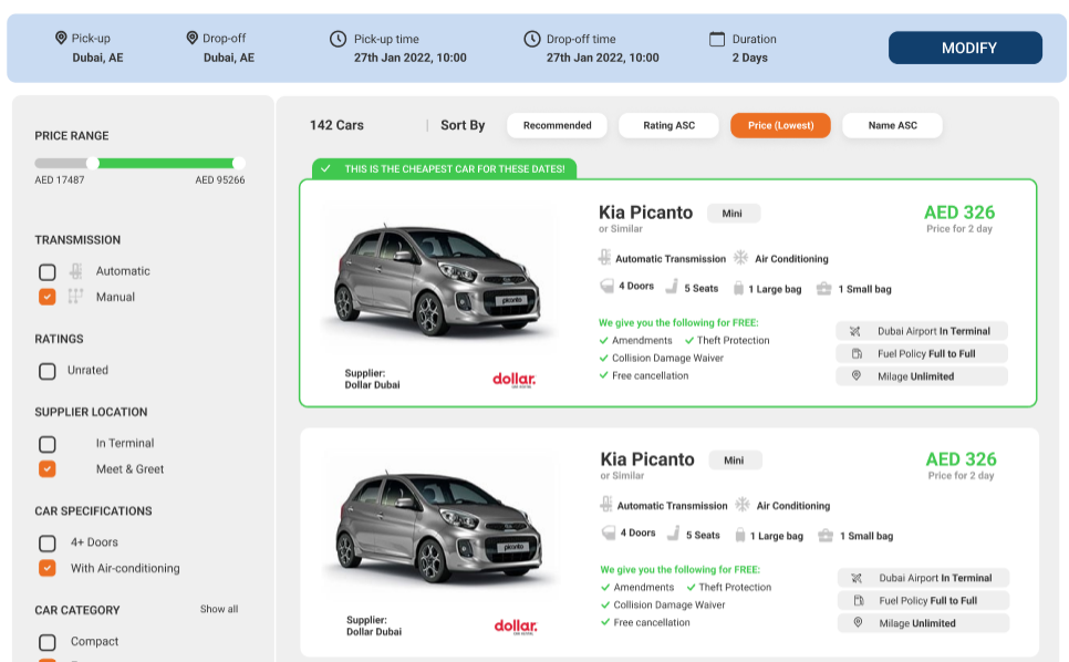 Wait for search results to load. Compare available “Cars” by getting your results sorted by “Highest or Lowest Price.” On the left row, you can feature the “Price Range.” Additionally, you can specify your preferred options on the same row. Or click on “Modify” tab to continue searching with different options.