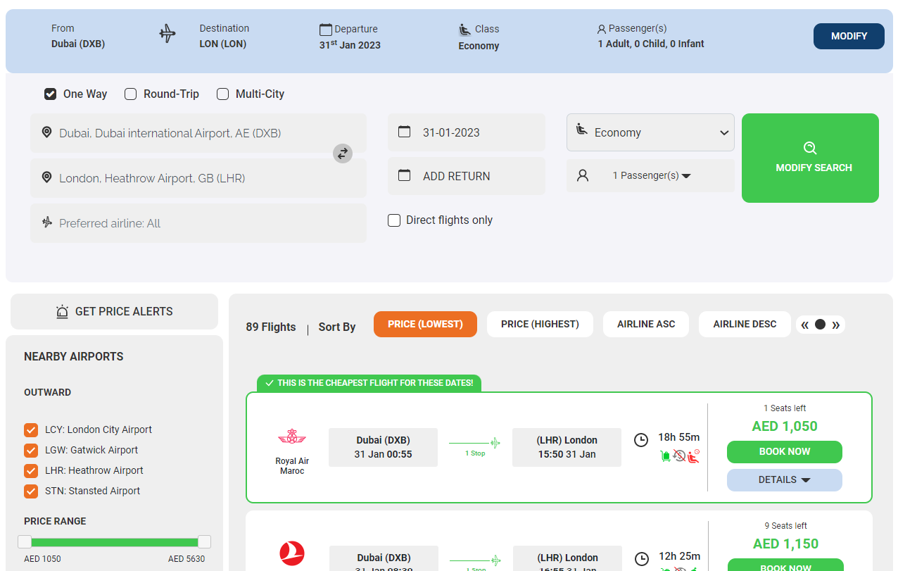 Wait for search results to load. Compare available airfares getting your results sorted by “Highest or Lowest Price First,” “Departure,” “Arrival,” and “Duration” times. On the left row, you can feature the range of “Price” or “Departure,” “Arrival,” or “Layover” times and “Flights” duration. You can also specify the “Airlines” and “Fare Type” (Refundable or Non-Refundable). Or click on "Modify" to continue searching with different options.