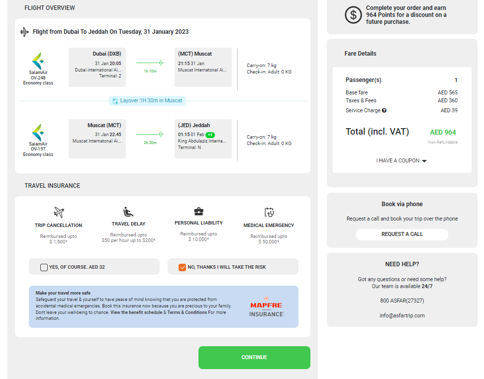 Check and confirm your flight details and select optional services (ex. Travel Insurance and Car Rental) and then click on "Continue" tab. Key in passenger information for all travelers with correct names, date of birth, passport number and passport expiry date in correct format date/month/year and then click on "Continue to Pay" tab to continue. Note: Bookings will fail if you have entered incorrect details.