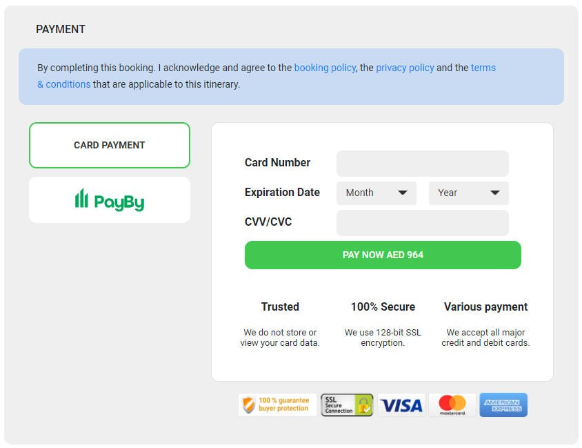 Complete payment with your preferred method, accept Terms and Conditions, and click on “Pay now” tab to finalize your booking. For credit card users, please be aware that your card should be on OTP else the payment will fail.