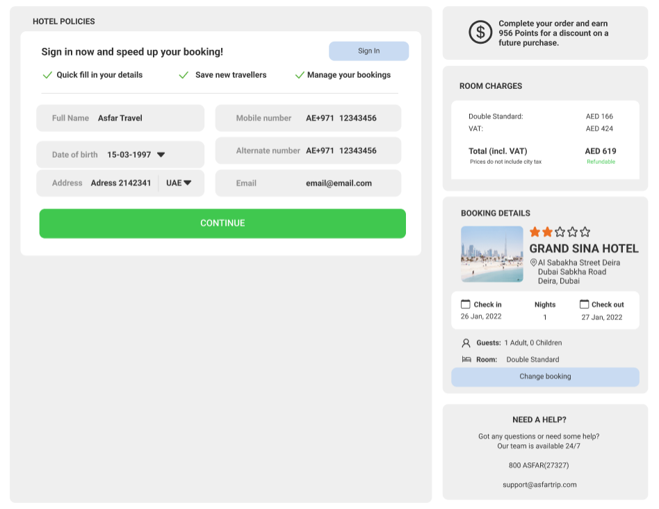 Key in information for all travelers with Correct Names, date of birth, passport no., and passport expiry date in correct format date/month/year and then click on "Continue" tab. Note: Bookings will fail if you have entered incorrect details.