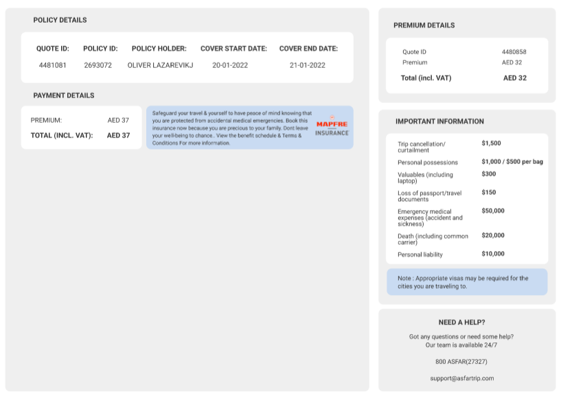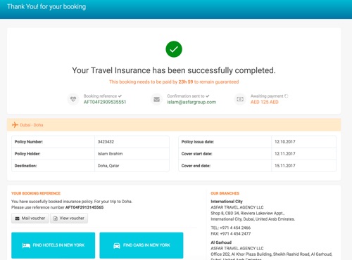 A confirmation page will appear to confirm that your booking was successful. You will also receive a confirmation e-mail once your payment is verified which contains all of your travel insurance details and important information.